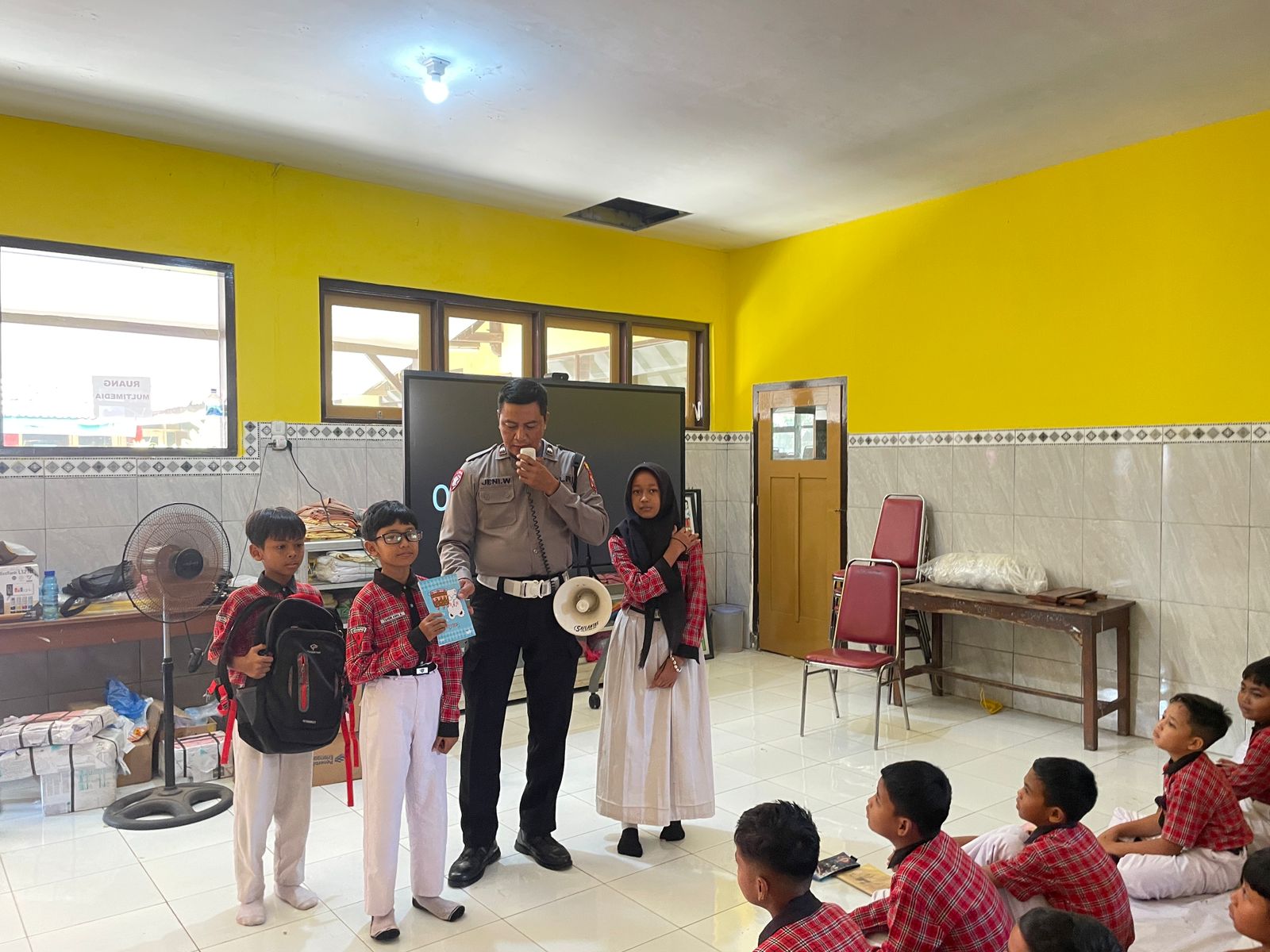 Selain memberikan edukasi, personel Satlantas juga membagikan helm, buku, tas, dan alat tulis kepada siswa sebagai bentuk apresiasi atas antusiasme mereka mengikuti kegiatan. Momen tersebut berlangsung hangat dan penuh semangat belajar.